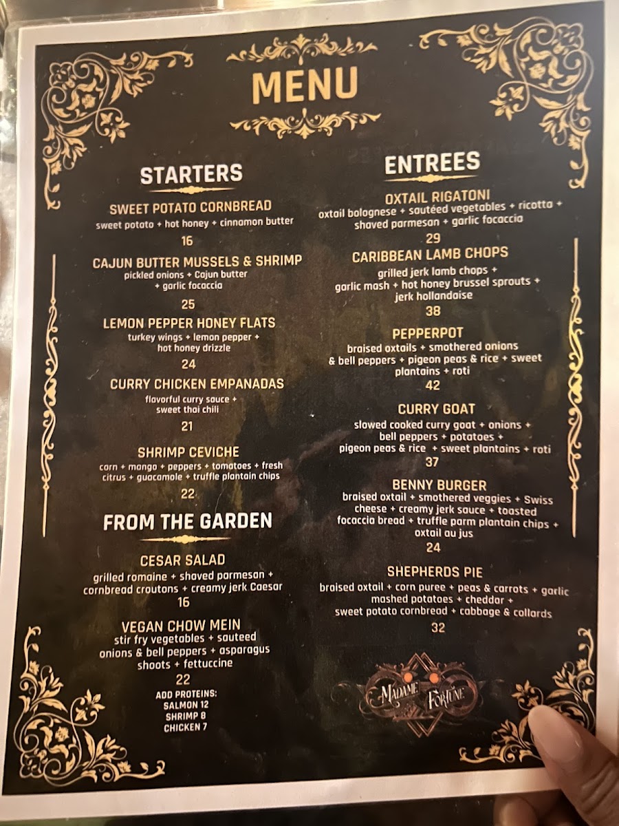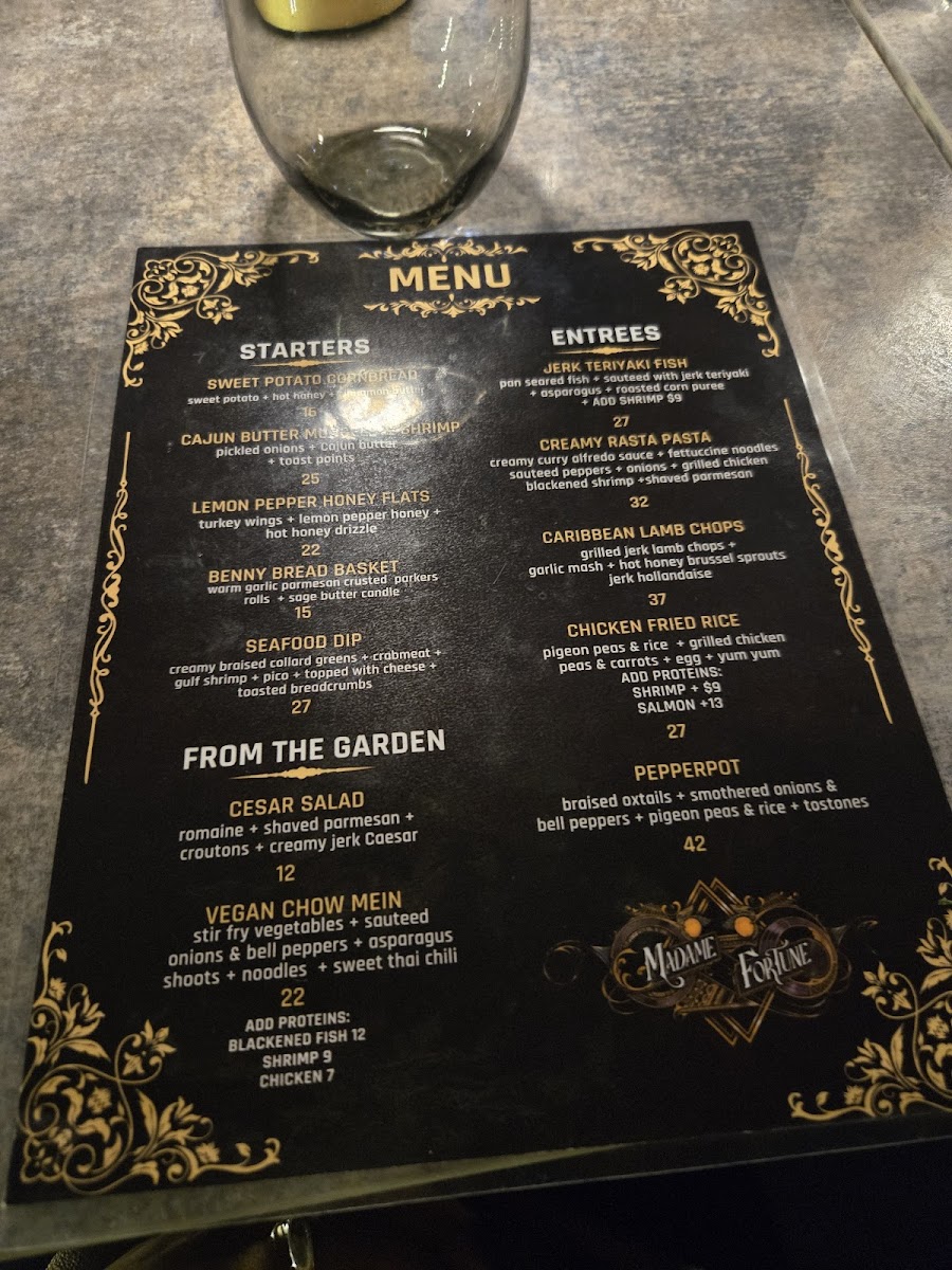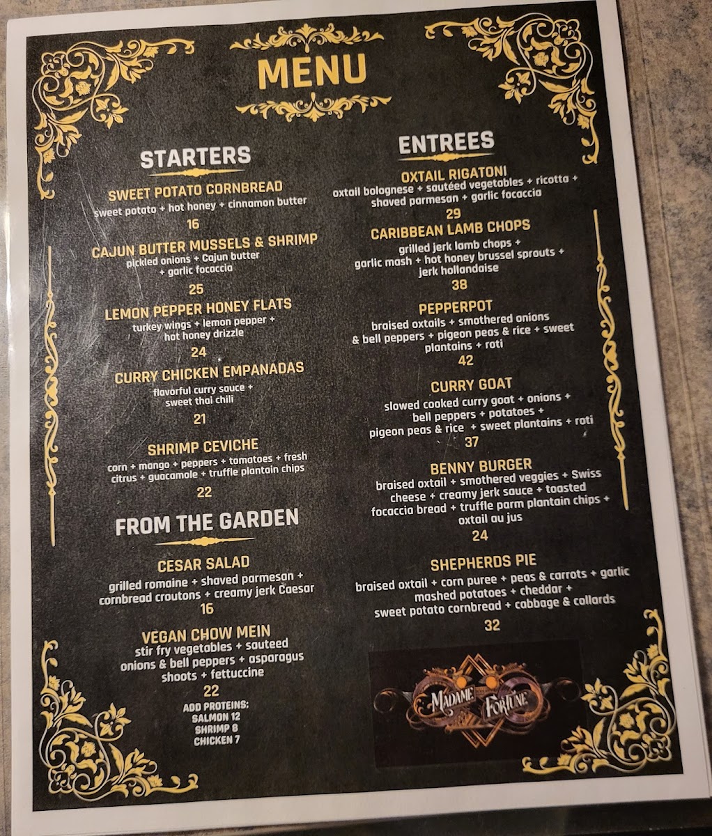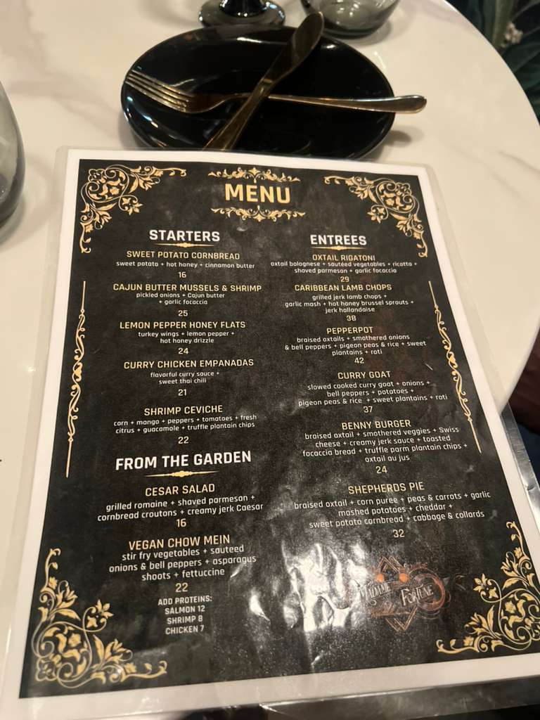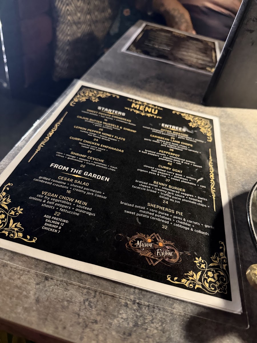 The menu at Madame Fortune Dessert + HiFi Parlour offers a blend of comforting, flavorful dishes and creative drinks that suit a relaxed yet vibrant dining experience. Here, you'll find a thoughtful mix of Southern-inspired dishes with Caribbean influences, alongside inventive cocktails that add a unique twist to the evening.